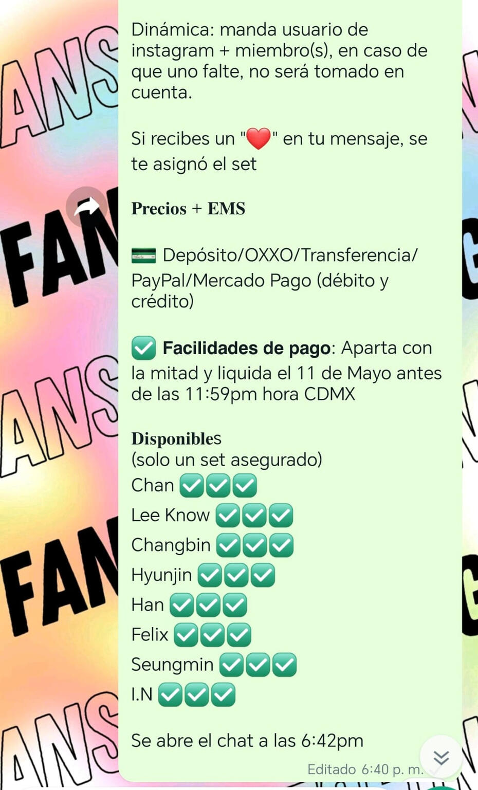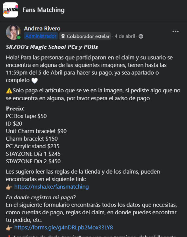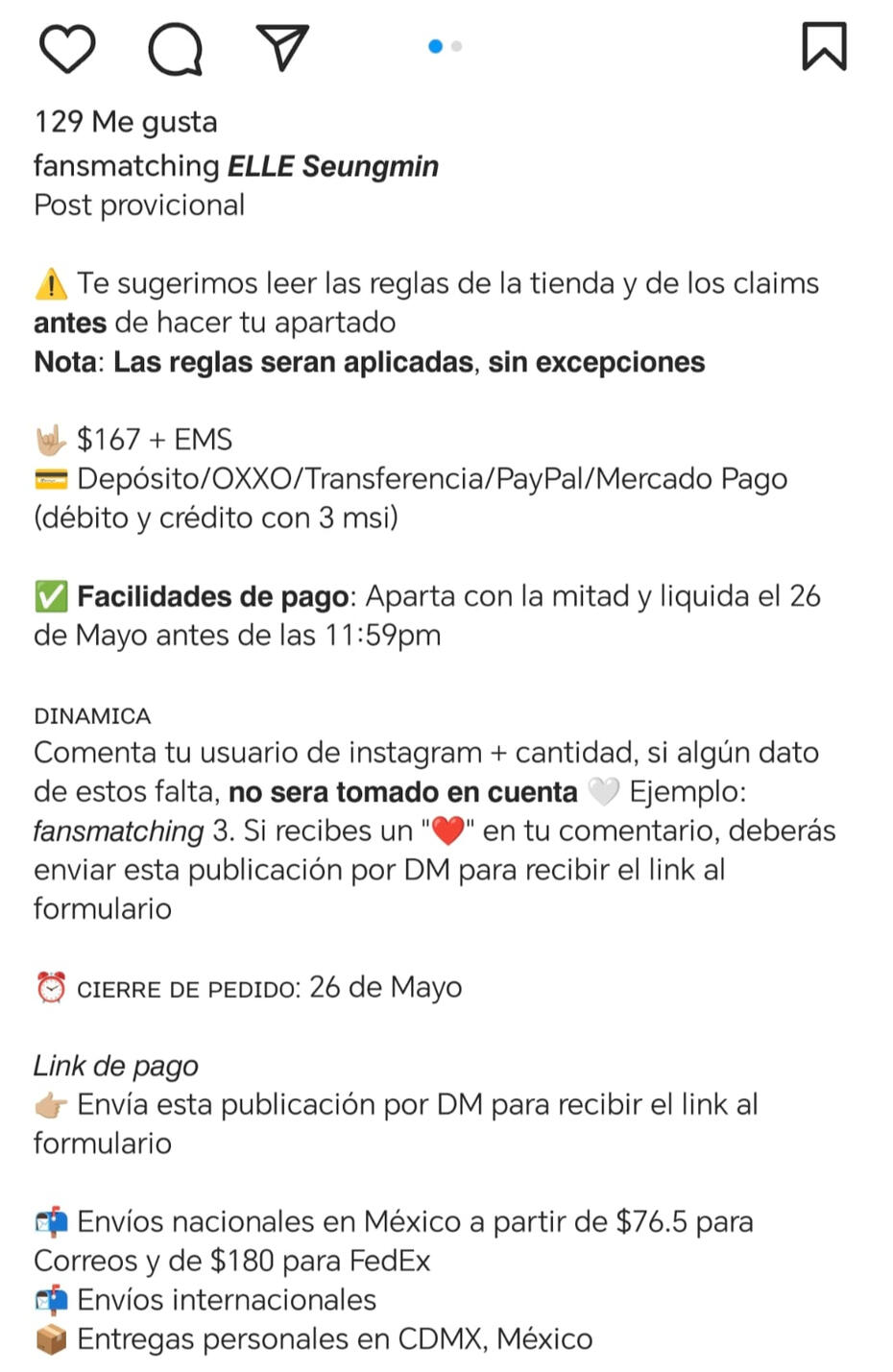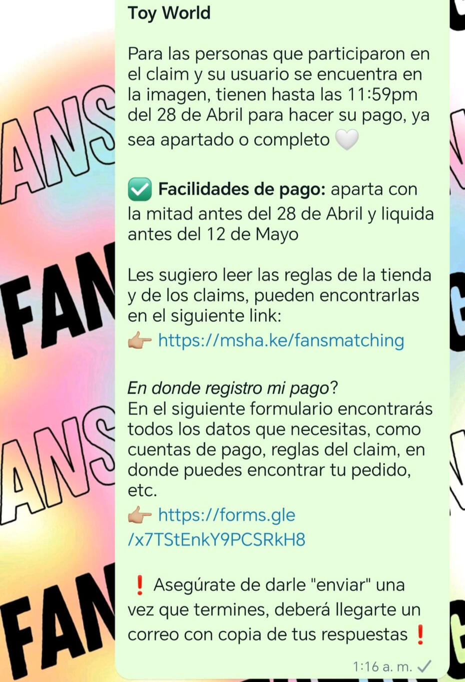 PAGOS🤍 Tendrás 24hrs para hacer tu pago y registrarlo a partir de que se te permita pagar, ya sea que enviemos un link o que le demos ❤️ a tu comentario/mensaje, todo dependerá de la dinámica. De no pagar a tiempo tu producto pasa a stock o a la siguiente persona, incluyendo que se registre después de la hora estipulada🤍 Es necesario registrar los pagos en los formularios correspondientes para que sea validado y registrado en la masterlist. Si pagaste pero no llenaste o no enviaste el formulario tu pago no será tomado en cuenta y no habrán reembolsos (parciales, totales o en especie) sin excepciones y tampoco se podrán utilizar para EMS, cargos o envíos, por lo que perderás tu dinero en su totalidad🤍 Si la dinámica pide esperar un aviso de pago, se avisará del pago en el mismo grupo donde se llevó a cabo el claim⚠️ Los pagos deben ser como se indican en la dinámica, si el pago debe ser completo entonces debes pagar el valor total. En caso de depositar otra cantidad a la indicada tu producto pasará a stock, no habrán reembolsos (parciales, totales o en especie) sin excepciones y tampoco se podrán utilizar para EMS, cargos o envíos, por lo que perderás tu dinero en su totalidad⚠️ Si se trata de apartados, la mínima cantidad que deberás pagar es la indicada en las dinámicas, en caso de que sea menos, tu pago no será tomado en cuenta⚠️ Si pagas tu producto cuando no te corresponde, es decir, cuando no se te ha brindado el formulario, cuando en el aviso no aparece tu usuario/nombre, cuando no se menciona tu set/producto, no habrán reembolsos (completos, parciales ni en especie), y tampoco se podrán utilizar para EMS, cargos o envíos, por lo que perderás tu dinero en su totalidad⚠️En caso de pagar de más, el dinero extra no será tomado en cuenta a menos que previo al pago hayamos dado un aviso o hayamos tenido un acuerdo por privado. En caso de que nosotros no tengamos conocimiento, el sobrante no será reembolsado de ninguna forma ni bajo ninguna sirconstancia y tampoco será tomado en cuenta para otro pago, por lo que perderás tu dinero en su totalidad⚠️Si haces un pago fuera del tiempo de las facilidades de tu pedido, no será tomado en cuenta y no hay reembolsos de ningún tipo⚠️Los envíos solo deben pagarse hasta que haya cotización del mismo, no antes. Cualquier pago hecho antes NO SERÁ TOMADO EN CUENTA, de ser el caso, no hay reembolsos monetarios (parciales o totales) ni en especie, deberás pagar de nuevo⚠️ Queda prohibido que si apartan dos o más productos paguen solo 1, por ejemplo: si son $160 de dos y solo pagan $80, se contarán $40 para cada una, lo que significa que no están pagadas y se aplicará la regla anterior, además, nos reservaremos el derecho de venta en futuros claims y tendrán su respectivo reporte en los grupos tanto de SKZ como de Kpop en general❌ Apartar tus productos (ya sea como comentario o mensaje) y no pagar ameritará una advertencia en los grupos de kpop y se reservará el derecho de venta en futuros claims, por tal motivo, este acto ESTA PROHIBIDO, esto incluye eliminar mensajes o comentarios⚠️Solo tomaremos en cuenta los artículos que pongas en tu formulario, incluso si depositas extra la cantidad solo será tomada en cuenta para los articulos que colocaste en el formulario a la hora de pagar. Aplica para pagos, liquidaciones, EMS, cargos, cruce y cualquier otro pago⚠️ Asegúrate de poder pagar tu producto tal como se pide, no hay plazos de pagos, ni se aceptan apartados cuando la dinámica indique que es pago completo, NO HAY ACUERDOS NI NEGOCIACIONES AL RESPECTO⚠️ De no pagar EMS, cargos aduanales y/o cruce (USA-Mx), tus artículos pasan a stock sin derecho a reembolso, y tampoco podrás recuperarlos con multa⚠️ En el caso de pagos de envios, EMS, cargos aduanales y/o cruce (USA-Mx), si no se anotan correctamente en el formulario correspondiente los productos que pagas, no tomaremos en cuenta tu pago ni tu formulario y deberás pagar de nuevo