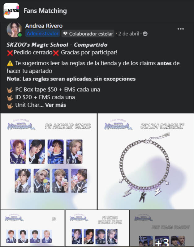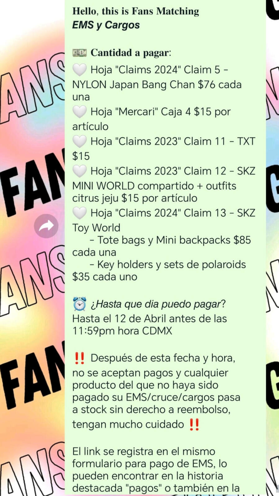 CLAIMS Y PEDIDOS🤍 Los precios siempre son + cargos (a menos que se indique lo contrario)🤍 Los cargos son los EMS, cruce y/o cargo aduanal🤍 Cuando se traten de sets OT8, solo se comprarán si están llenos en su totalidad, aún cuando solo 1 no haya sido reclamado🤍Tendrás apartado tu producto hasta que hagas el pago de tu apartado🤍 Será(n) tuyo(s) hasta que las liquides en su totalidad, en caso de no pagar a tiempo, tus cosas pasan a stock sin derecho a reembolso (incluyendo cargos)🤍 Una vez que recibas un ❤️ en tu mensaje o comentario, significa que se te asignó el producto🤍 El formulario para el registro de sus pagos se mandará al finalizar el claim o cuando se llene algún set, debes estar pendiente (a menos que se indique lo contrario)⚠️Por favor lee atentamente las dinámicas, no se tomarán en cuenta aquellos mensajes/comentarios que no estén escritos como se piden, sin excepciones⚠️Durante un claim en Whatsapp favor de no mandar mensajes o comentarios ajenos al mismo, para mantener un orden (incluyendo stickers, emojis, etc)⚠️No se resolverán dudas por privado ni en el grupo durante los claims de WhatsApp⚠️Si después del claim de Whatsapp te surge alguna duda, se resolverá en el grupo, a veces tu duda es la de 3 personas más❌ No está permitida la re-venta de los productos ofrecidos en la tienda, ni dentro ni fuera del grupo. No nos hacemos responsables si decides vender tus productos antes de tenerlos en tus manos. Si lo necesitas, solicita nuestro servicio de Proxy⚠️ En caso de que surja una situación del punto anterior, tendrás reporte en los grupos de kpop y SKZ y no se te entregarán tus productos ni se te hará ningún tipo de reembolso, ya sea completo, parcial o en especie⚠️ Asegúrate de leer bien toda la información presentada en los claims y el formulario respectivo, ya que de preguntar algo que se encuentre dentro de los mismos recibirás la siguiente respuesta: "Puedes revisar la publicación o el formulario para obtener más información al respecto"